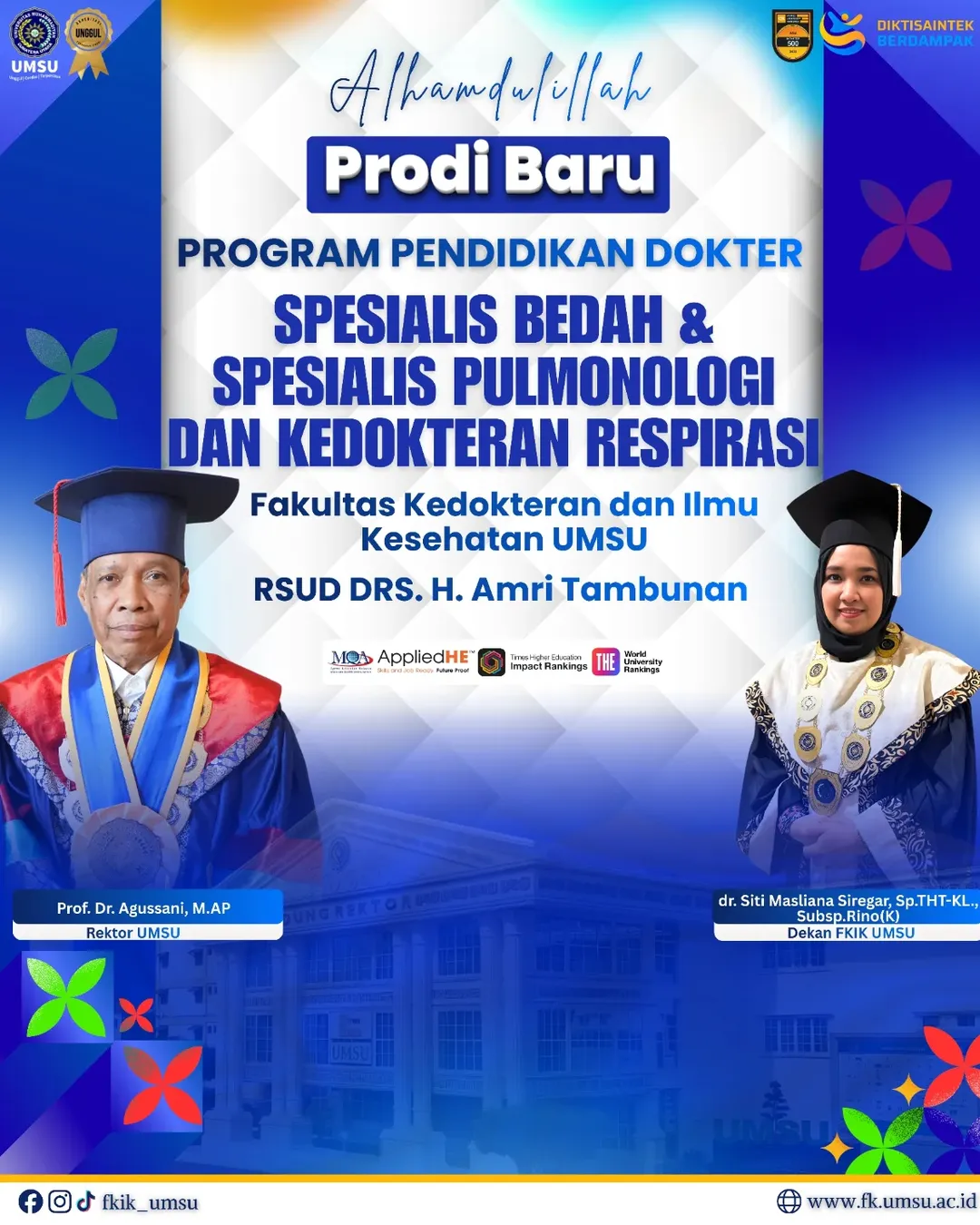 Medan – Kabar gembira dan kebanggaan menyelimuti civitas akademika Fakultas Kedokteran dan Ilmu Kesehatan Universitas Muhammadiyah Sumatera Utara (FKIK UMSU). Dengan mengucap syukur Alhamdulillah, FKIK UMSU secara resmi mengumumkan pembukaan dua program studi baru pada jenjang pendidikan spesialis, yaitu Program Studi Pendidikan Dokter Spesialis Bedah dan Program Studi Pendidikan Dokter Spesialis Pulmonologi dan Kedokteran Respirasi.