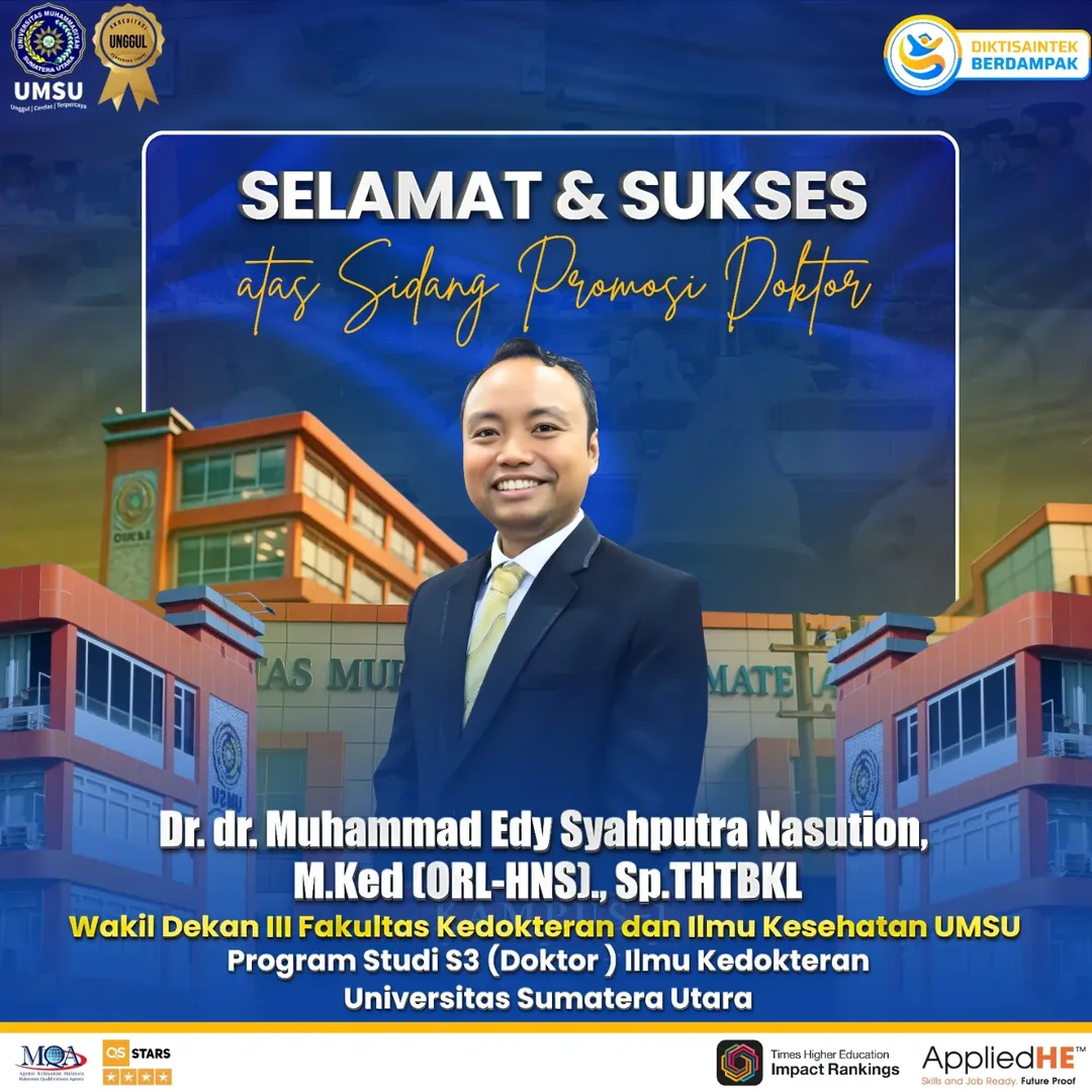 MEDAN – Keluarga besar Fakultas Kedokteran dan Ilmu Kesehatan (FKIK) Universitas Muhammadiyah Sumatera Utara (UMSU) menyampaikan ucapan selamat dan kebanggaan yang setinggi-tingginya kepada Dr. dr. Muhammad Edy Syahputra Nasution, M.Ked(ORL-HNS)., Sp.THT-KL, atas keberhasilannya meraih gelar Doktor Ilmu Kedokteran.