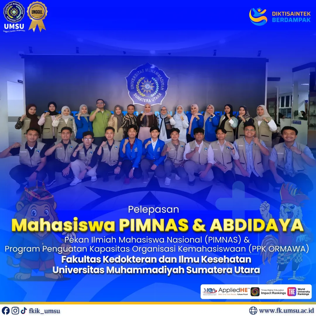 MEDAN – Fakultas Kedokteran dan Ilmu Kesehatan Universitas Muhammadiyah Sumatera Utara (FKIK UMSU) dengan penuh kebanggaan melaksanakan acara pelepasan mahasiswa yang akan berlaga di dua ajang prestisius nasional, yaitu Pekan Ilmiah Mahasiswa Nasional (PIMNAS) dan program Abdidaya (PPK ORMAWA). Kegiatan pelepasan ini merupakan bentuk apresiasi tinggi fakultas atas dedikasi, inovasi, dan komitmen luar biasa yang telah ditunjukkan oleh para mahasiswa dalam mempersiapkan diri menghadapi kompetisi dan pengabdian masyarakat tersebut.