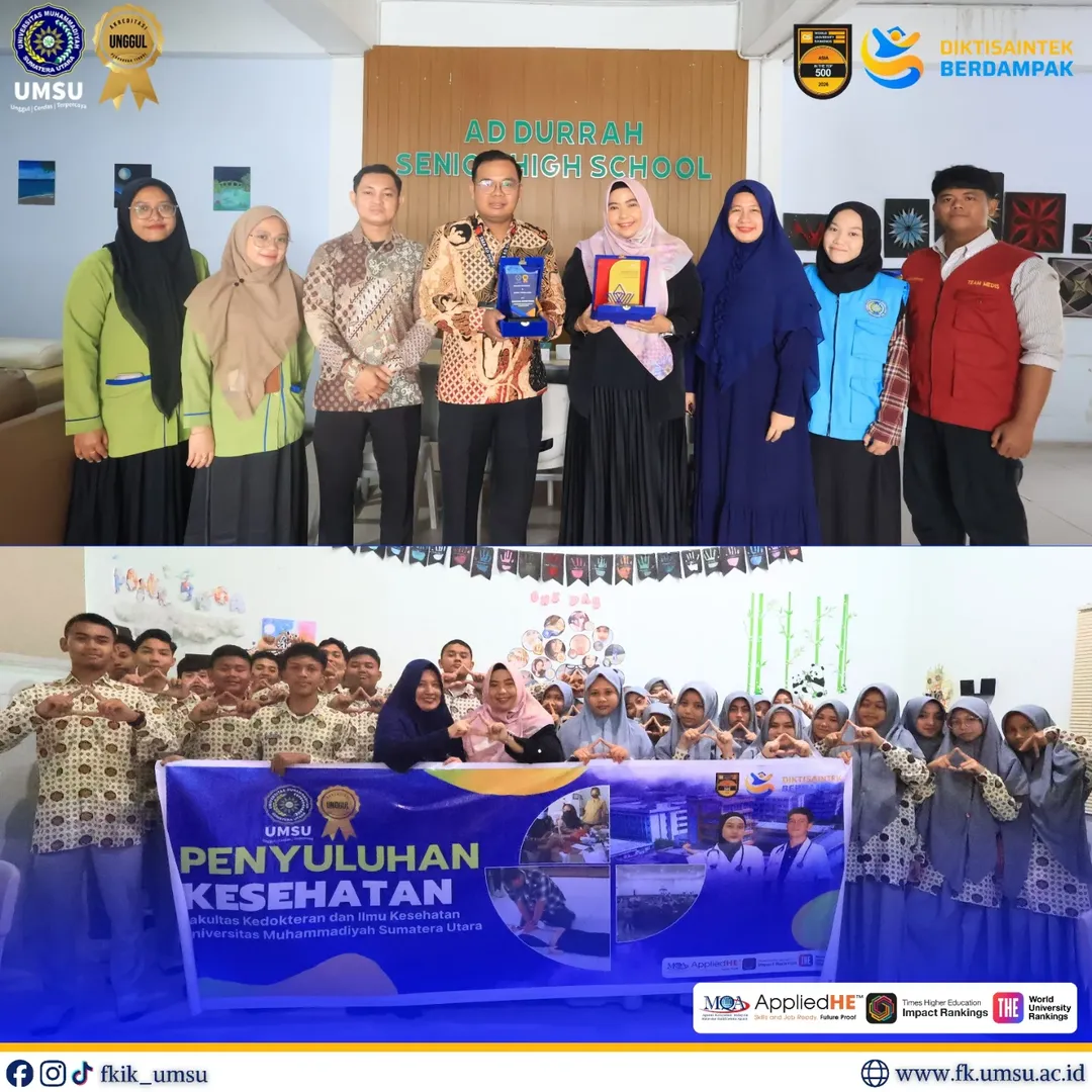 MEDAN – Sebagai wujud komitmen nyata dalam meningkatkan pengetahuan dan kesadaran kesehatan masyarakat sejak dini, Fakultas Kedokteran dan Ilmu Kesehatan Universitas Muhammadiyah Sumatera Utara (FKIK UMSU) melaksanakan kegiatan penyuluhan kesehatan di SMA Unggul IT Ad Durah. Kegiatan ini merupakan bagian dari program pengabdian masyarakat yang berfokus pada edukasi kesehatan untuk generasi muda.