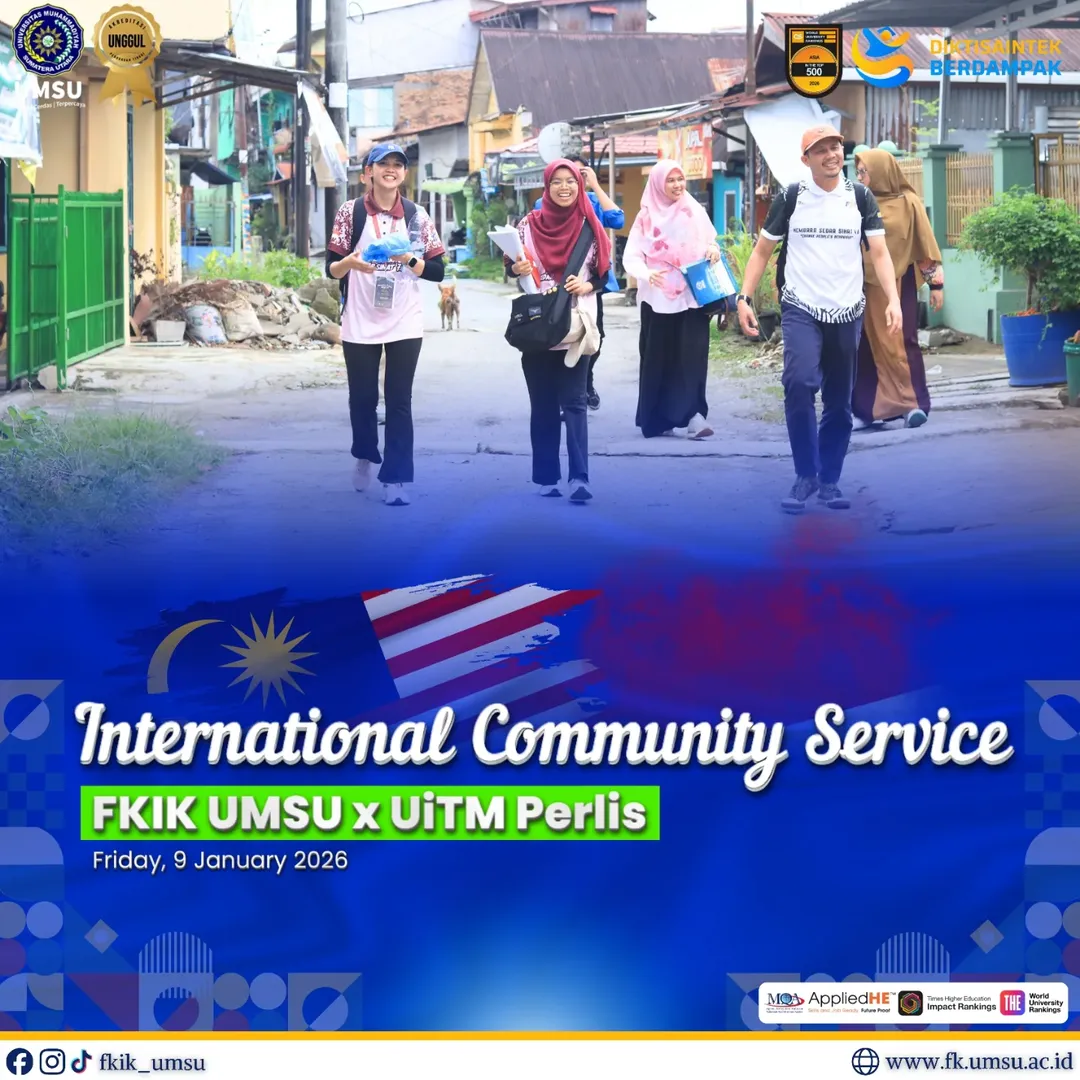 Medan – Kolaborasi internasional tidak hanya berhenti di ruang kuliah. Fakultas Kedokteran dan Ilmu Kesehatan (FKIK) Universitas Muhammadiyah Sumatera Utara (UMSU) bersama Fakultas Ilmu Olahraga dan Rekreasi (Faculty of Sports Science and Recreation) Universiti Teknologi MARA (UiTM) Perlis, Malaysia, membuktikannya dengan melaksanakan program pengabdian masyarakat di desa binaan FKIK UMSU. Kegiatan yang dilaksanakan pada Jumat, 9 Januari 2026, ini menjadi wadah nyata sinergi akademik lintas batas negara.