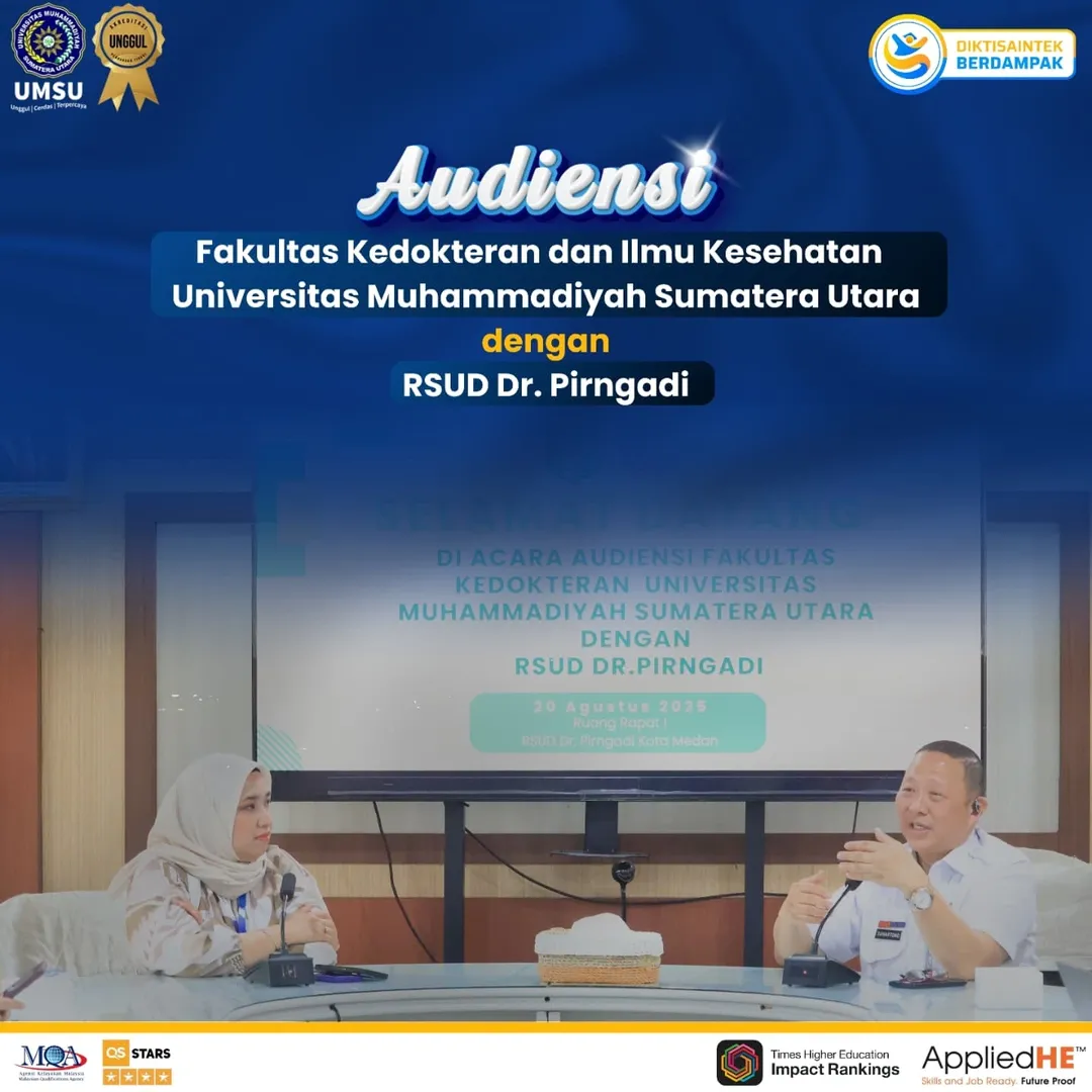 Medan, 20 Agustus 2025 – Fakultas Kedokteran dan Ilmu Kesehatan (FKIK) Universitas Muhammadiyah Sumatera Utara (UMSU) melakukan kunjungan audiensi penting ke Direksi RSUD Dr. Pirngadi Kota Medan pada Rabu, 20 Agustus 2025. Pertemuan yang berlangsung dalam atmosfer hangat dan penuh kolaboratif ini menandai babak baru dalam mempererat kemitraan strategis antara dunia pendidikan dan layanan kesehatan praktis.