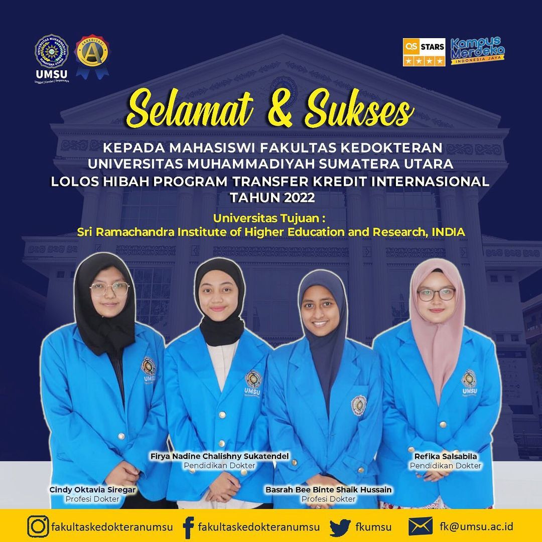 Mahasiswa Fakultas Kedokteran Universitas Muhammadiyah Sumatera Utara (FK UMSU) mengikuti program Transfer Kredit Internasional ke Universitas Sri Rahmachandra di India. Fakultas Kedokteran UMSU mengirimkan 4 mahasiswa yang terpilih untuk mengikuti program tersebut.
